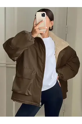 Xhaketa elegante e grave për dimër me jakë pellush dhe jakë që qëndron lart sjell një kombinim të shkëlqyer mes ngrohtësisë dhe finesës, duke u bërë një zgjedhje ideale për ditët më të ftohta.