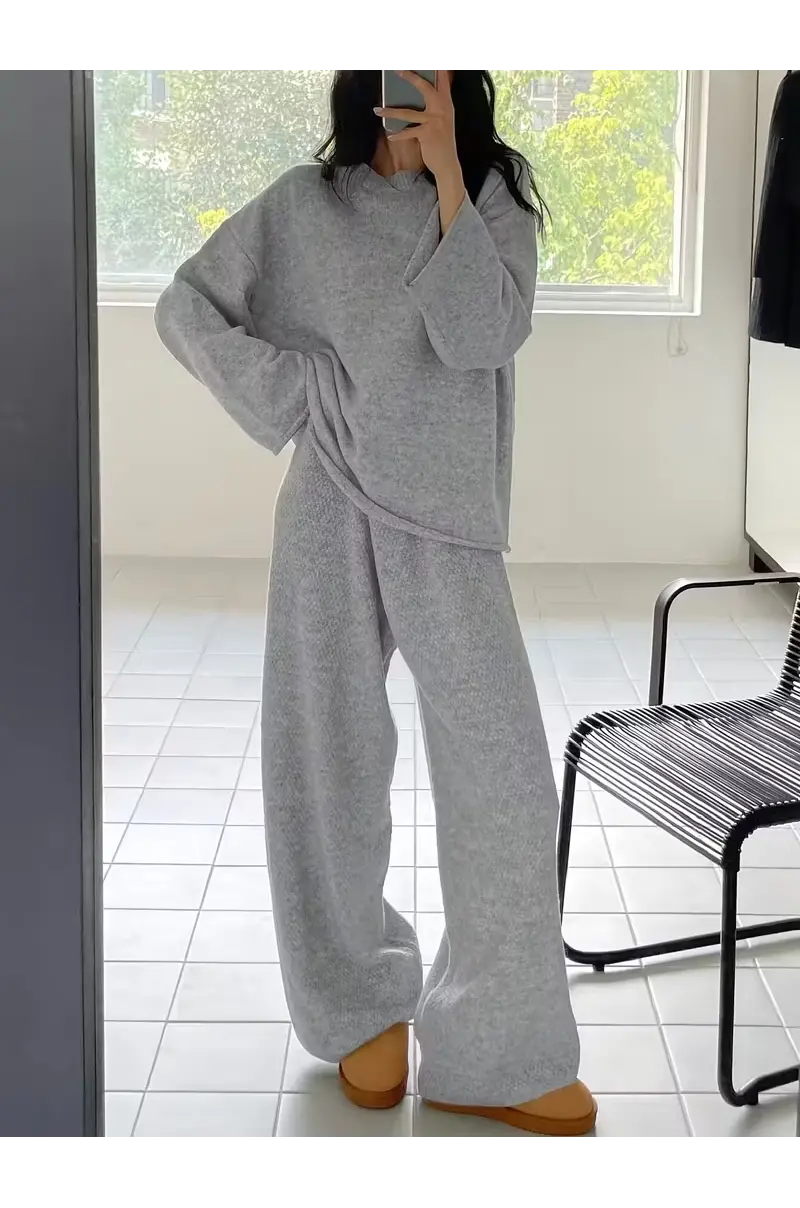 Set dy pjesësh për femra pulovër oversize me mëngë të gjera dhe pantallona me këmbë të gjera, në ngjyrë të njëtrajtshme. Dizajn elegant dhe i rehatshëm, me qafë të rrumbullakët, mëngë të gjata dhe prerje të lirshme, perfekt për veshje casual elegante gjatë vjeshtës dhe dimrit.