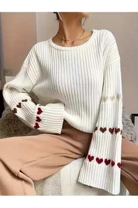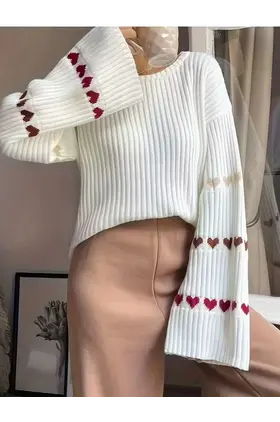 Pulovër elegante për femra në ngjyrë të bardhë e kafe, me zemra dekorative.